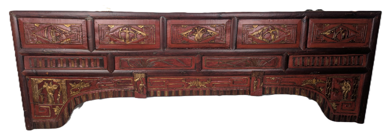 Our Chinese Antique Fujian Opium bed Panel is hand carved and painted in rich golds, ox blood red with natural wood highlights. These antique panels are approximately 60-80 year old, were found in Fujian China and restored. These were the focal point of a opium bed and now can be used as a unique valance, headboard or wall art. As these are antiques, your piece may vary slightly from the one pictured. Dimensions: 61"inches x 1"inches x 27" high. Made of Elm wood with iron hangars these make a fine decorative piece over a Buffet, use as a frame around a door way.