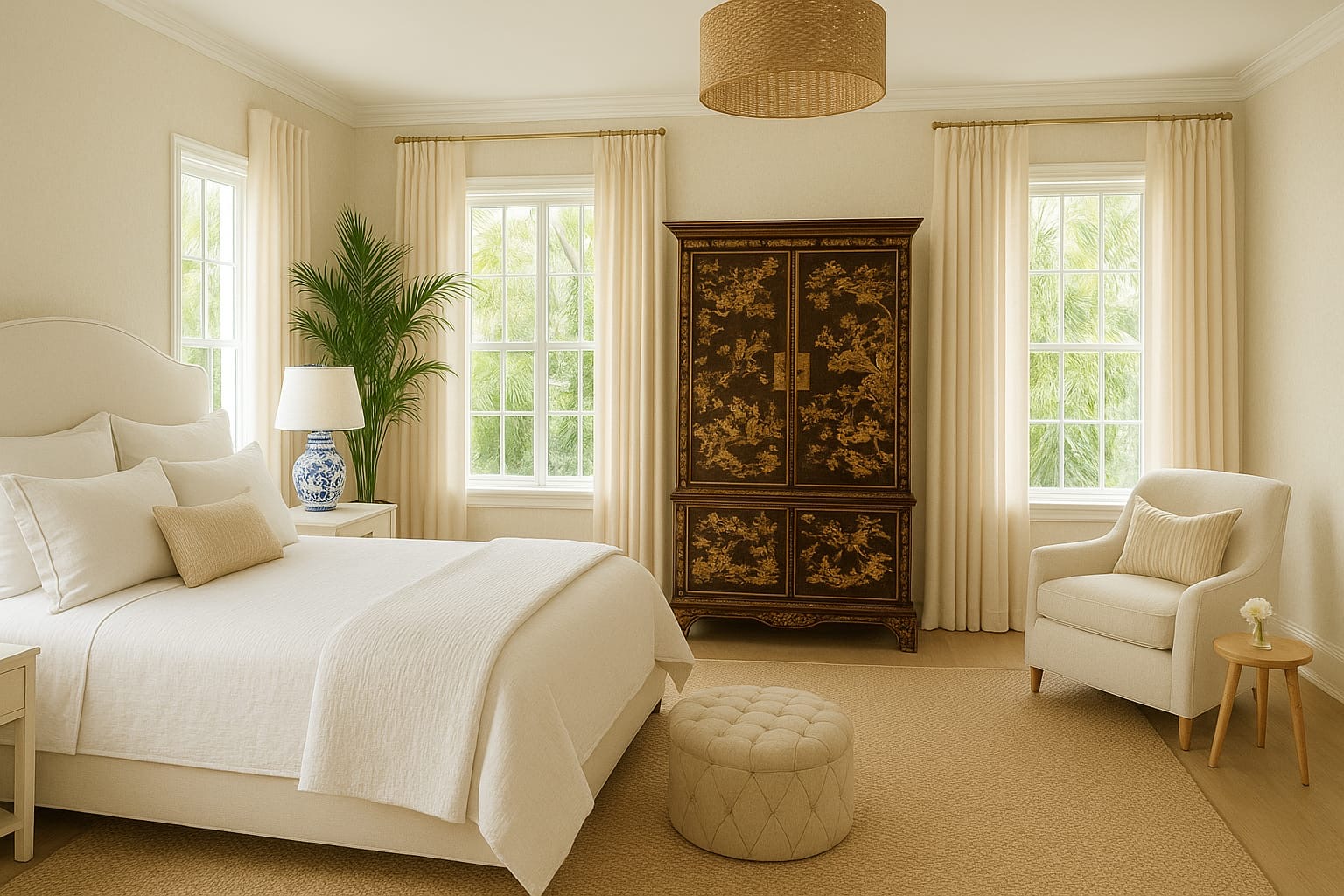 Most often seen in coastal homes, boutique hotels, and resort-style residences, Palm Beach–inspired interiors extend well beyond the shoreline in appeal. This aesthetic is frequently featured in interior design magazines, lifestyle blogs, and showhouses, and is championed by designers and brands specializing in classic, globally influenced, and coastal-inspired interiors.