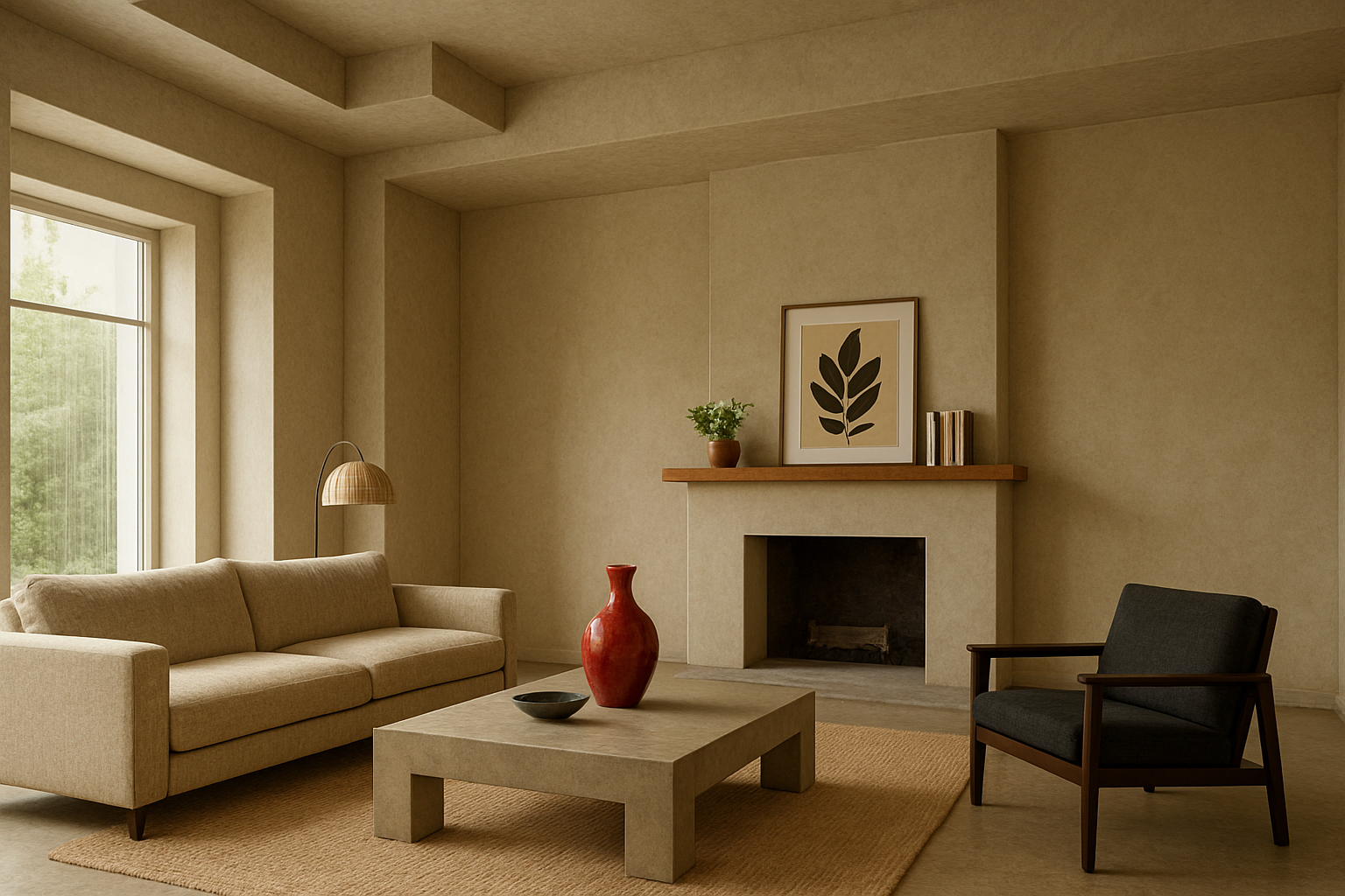 Each room is wrapped in soothing, monochromatic beige plaster, allowing light to flow softly across clean architectural lines. The palette is intentionally understated, creating a serene backdrop where textures, shapes, and handcrafted details become the true focal points. Low-profile furnishings in natural wood ground the space, while the simplicity of the forms brings a museum-like calm.