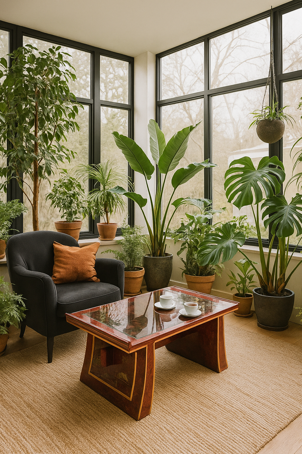 Greenery takes on new importance when displayed in character-rich vessels. A Japanese Satsuma planter introduces color, artistry, and organic energy all at once . Nearby, a three-legged antique stool becomes both accent and conversation starter, blending utility with charm.