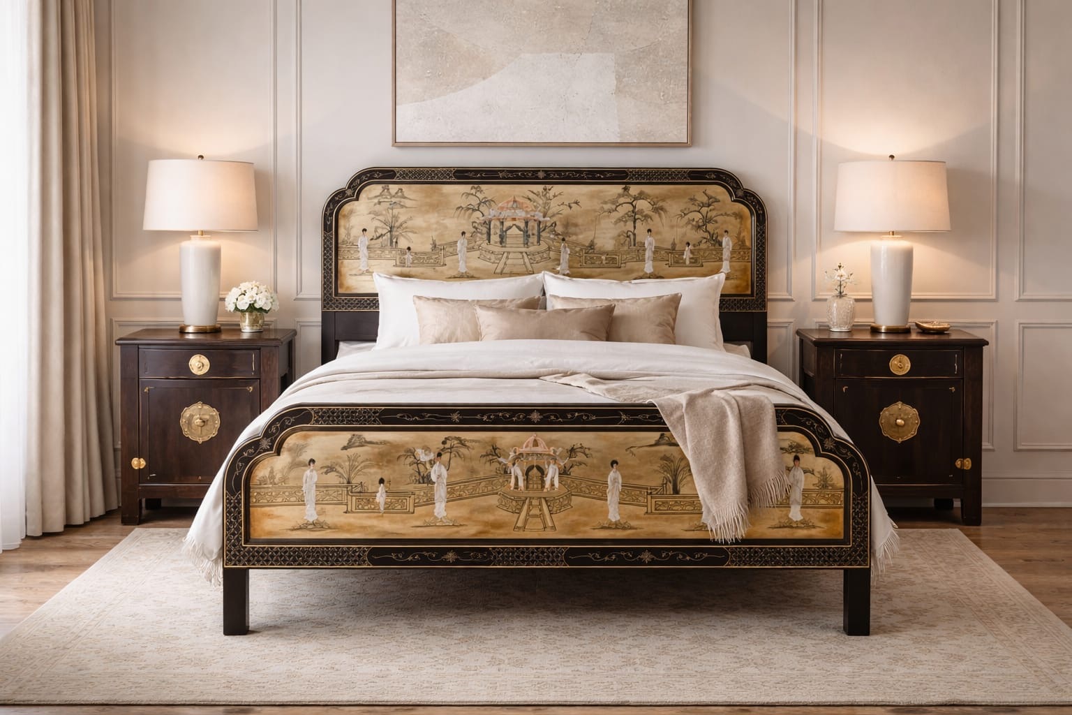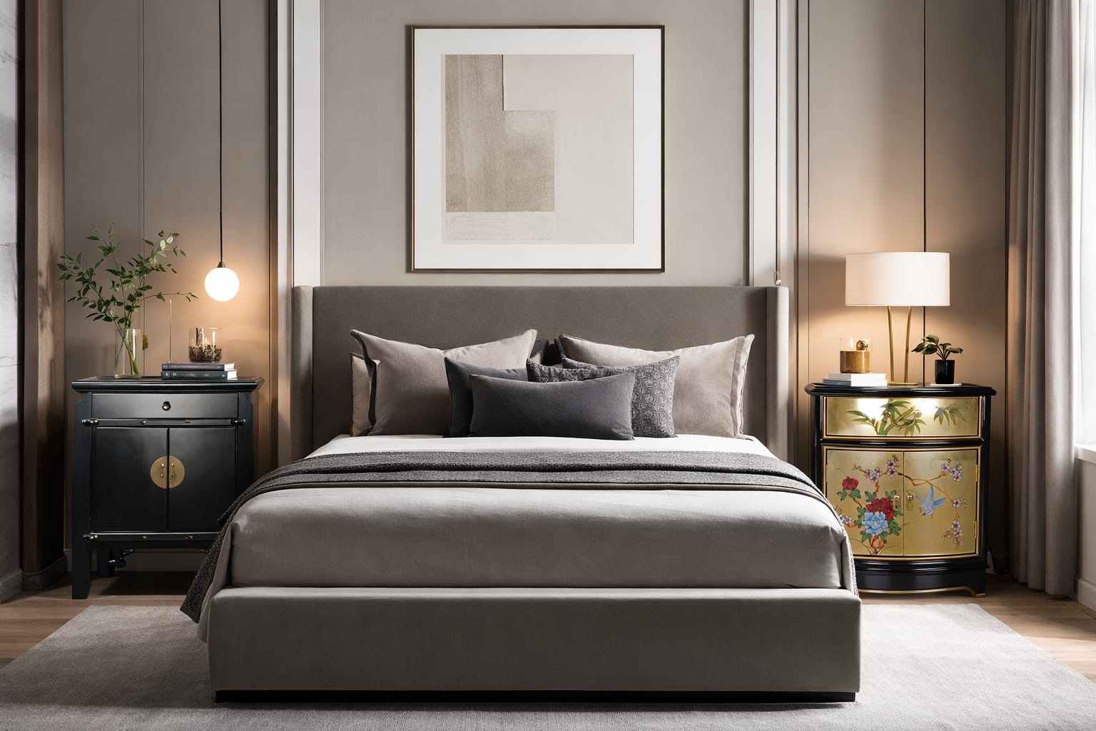 A more finished interior tends to unfold through contrast and thoughtful layering. Pieces relate to one another without needing to mirror each other exactly. A bedroom might feel richer with two nightstands that differ slightly in tone or form—perhaps a darker wood cabinet on one side and a painted or lacquered table on the other. That small variation introduces depth and suggests the room has been assembled gradually, with intention rather than convenience.