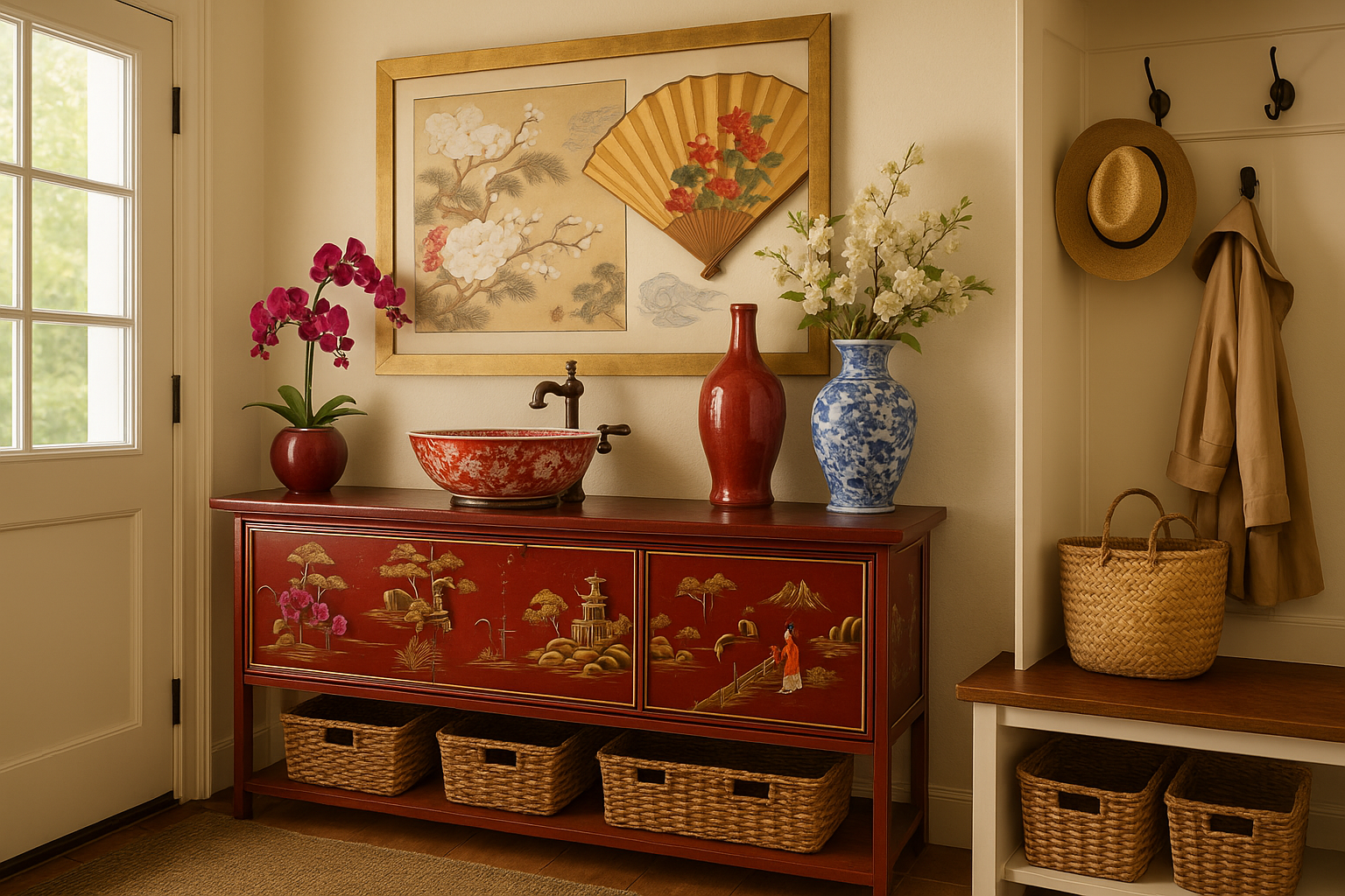 Red and gold have long symbolized balance, prosperity, and refinement. When layered across a home’s design—from the living room to the bedroom and even the mudroom—they create a cohesive story of elegance rooted in tradition yet suited for contemporary living.