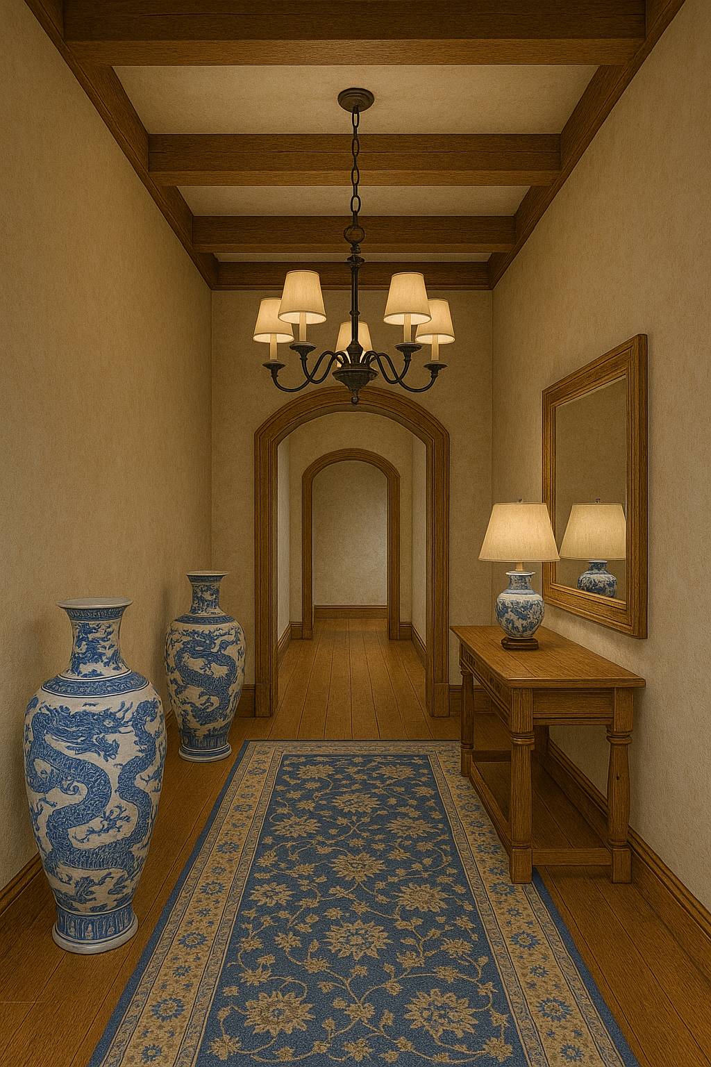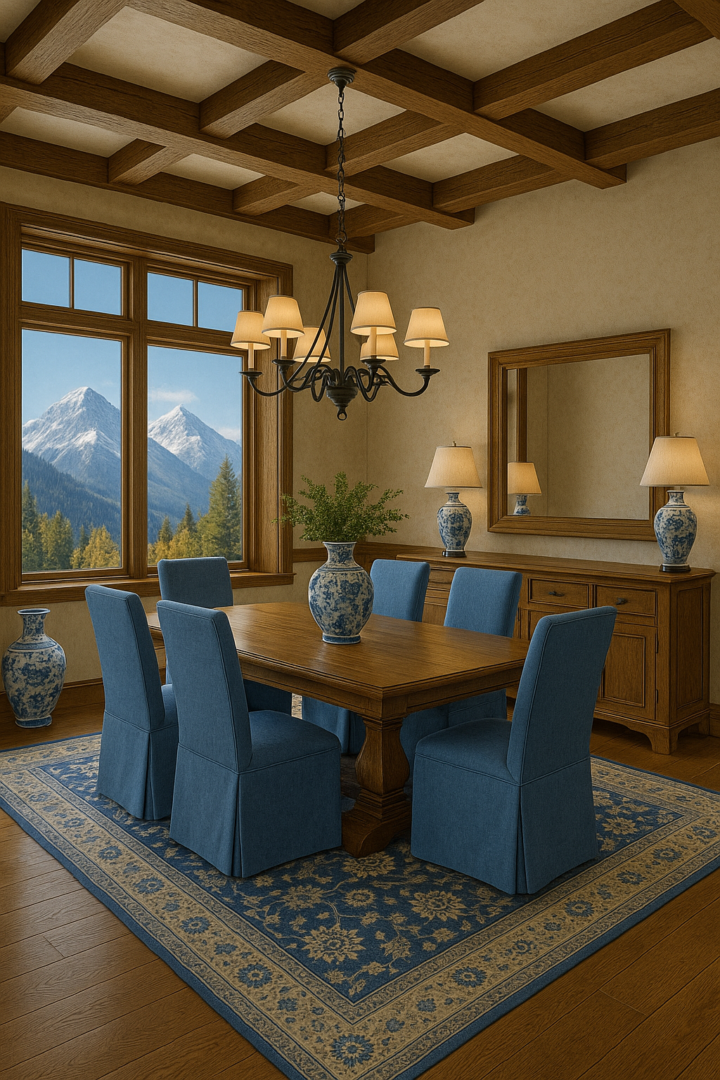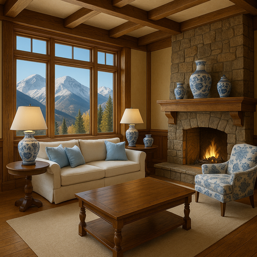 This mountain retreat blends rustic warmth with timeless Oriental charm. Natural wood beams, stone details, and soft neutral walls create a cozy backdrop, while blue-and-white porcelain accents bring sophistication and a sense of heritage. From the living room to the dining room, bathroom, and hallway, each space feels serene, welcoming, and beautifully connected. It’s a perfect example of how classic mountain style can meet global elegance — creating a retreat that’s both relaxing and unforgettable.