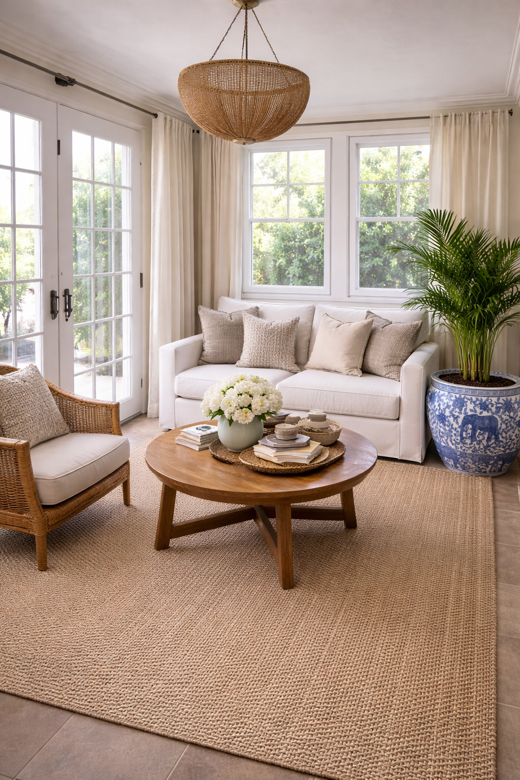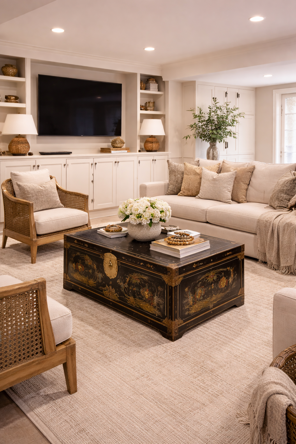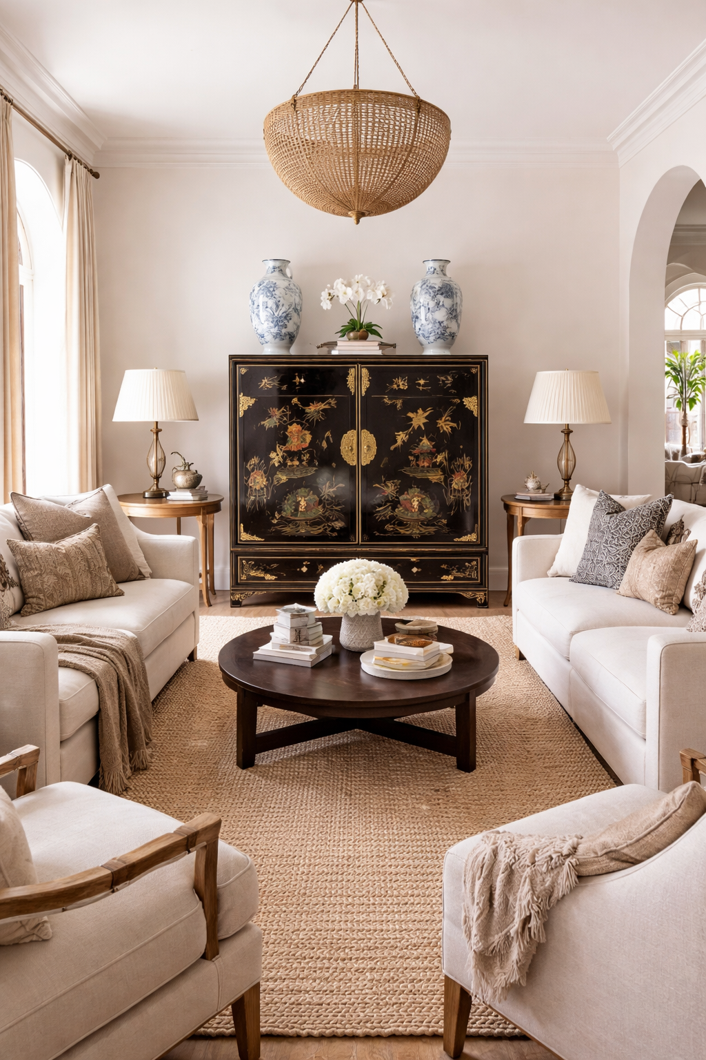 In each of these rooms, a single standout item — whether an ornate Oriental cabinet, a vintage trunk used as a coffee table, or a blue-and-white porcelain planter — becomes the visual anchor. The surrounding furniture remains soft, neutral, and understated, allowing the statement piece to shine without overwhelming the room.