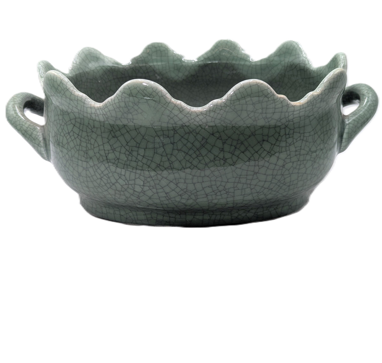 Rare crackle Celadon porcelain is hard to make, fired at very high heat for strength, even color, and consistent crackle. This is what we look for and have found for your collection. The color resembles jade, and porcelain is stronger than ceramic because it is harder and less likely to chip, crack, or scratch. This Chinese Celadon scallop planter is carefully handmade, shaped like a clam shell. It is unique, watertight, and glazed inside and out for years of use. It works well in high-traffic areas, outdoors, and in places with moisture. Use it as a table bowl or planter on a tabletop, coffee table, or dining table. This 14" planter is the right size for a large table top or the floor.