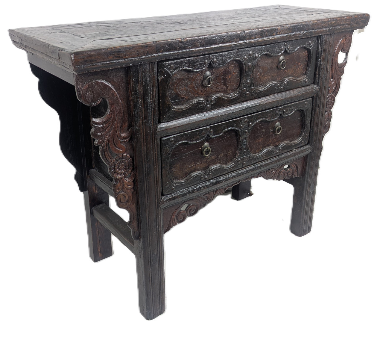 Our Chinese antique cabinet is clear coated with lacquer that enhances the natural wood grain and the hints of antique red in the drawer panels. This 90 year old item is hand carved, with floral cloud shaped sides and carved drawers. Two drawers make this a fine entryway piece, offering storage capacity and unique looks with a history to boast. Unusual Cloud shaped carvings and rich red and deep Elmwood finish with a vintage appeal. Found in northern China, it is about 90 years old. Refinished with new brass hardware and hand rubbed lacquer to enhance its age. Clean and simple lines with Ming style elements, it measures 43" x 17" x 33" inches high. Use in a bedroom for clothing or in the living room as an entertainment center. Works in modern, rustic, or cottage interiors. Refinished inside and out. o. At this price, don't hesitate.