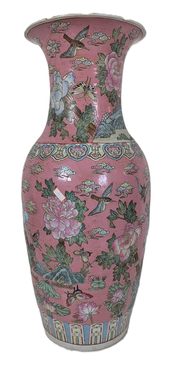 Our former supplier from Macau Porcelain reached out to us with an opportunity to purchase some vintage stock. This rare, vintage item is one of the imports we've made. A treasure of a find, this 36-inch-tall Chinese porcelain is hand made with a beautiful Chrysanthemum and Butterfly painting on a rich pink coral background. The hand glazing is thick to the touch, and like older collectable vases, it is relatively heavy. This vintage Chinese vase is decorated with four distinct painted patterns and a fluted, carved top. The multiple details of this vintage vase are seldom found or produced today. This Chinese vase is painted with a rich floral palette of pinks, greens, reds, and yellows. This unique and stunning three foot tall vase will make a colorful addition to your entryway, garden, or home interior. This Chinese temple vase will add an Asian touch to your home interior design. For added charm, consider a wooden vase or wooden fishbowl stand.