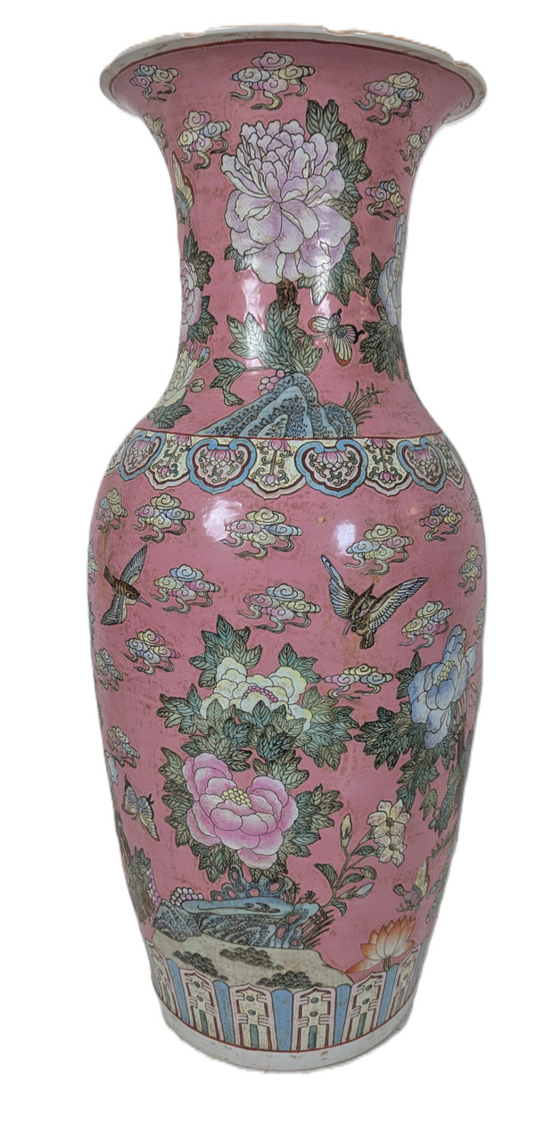 Our former supplier from Macau Porcelain reached out to us with an opportunity to purchase some vintage stock. This rare, vintage item is one of the imports we've made. A treasure of a find, this 36-inch-tall Chinese porcelain is hand made with a beautiful Chrysanthemum and Butterfly painting on a rich pink coral background. The hand glazing is thick to the touch, and like older collectable vases, it is relatively heavy. This vintage Chinese vase is decorated with four distinct painted patterns and a fluted, carved top. The multiple details of this vintage vase are seldom found or produced today. This Chinese vase is painted with a rich floral palette of pinks, greens, reds, and yellows. This unique and stunning three foot tall vase will make a colorful addition to your entryway, garden, or home interior. This Chinese temple vase will add an Asian touch to your home interior design. For added charm, consider a wooden vase or wooden fishbowl stand.