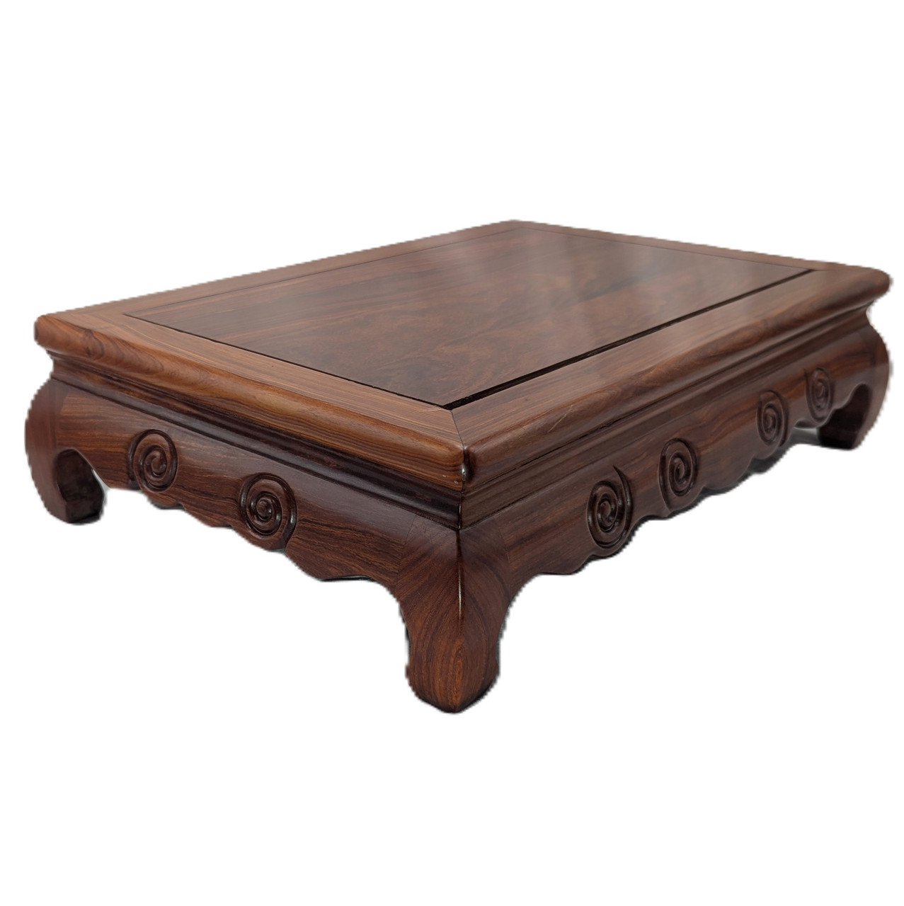 We have been asked to acquire a large display stand for tabletop or floor use, and now we have this beautifully made, rare rectangular display stand crafted from solid rosewood and ready for your tabletop or as a low meditation table. With a honey color finish and water-resistant lacquer, it has an elegant design and is perfect for display on your tabletop. Rosewood is known for its exquisite grain and hardness, and is used only by fine craftsmen with expertise in rare and valuable hardwoods. A clear, shiny, natural lacquer finish enhances the rich wood grain of this table. The top measures 17.5 by 11.5 inches. Vase stands add height and contrast to any display, sculpture, or vase, and add importance to what is being displayed. The light honey color and natural contrasting wood grain create an attractive base for your collectible. The simple Asian design, with Buddha feet and simple scroll carvings, adds elegance without detracting from your item. A damp cloth with water is recommended for cleaning. We are committed to ensuring customer satisfaction, so you can purchase with confidence knowing we take every step to protect and deliver your item securely.