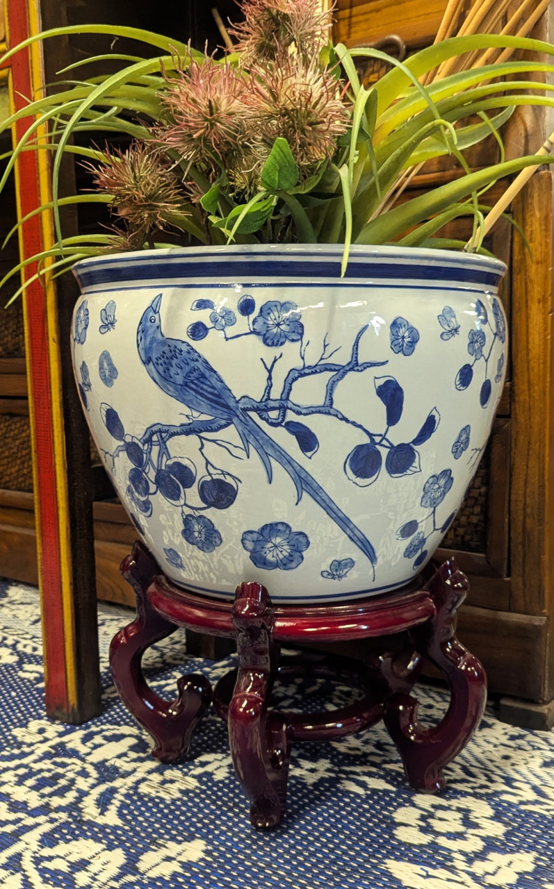 Our sixteen inch wide Chinese blue and white porcelain planters showcase delicate cobalt blue florals and birds swirling across a luminous bone white canvas. Instantly transform any space, from sunlit gardens to cozy interiors, with their captivating presence. Use them as elegant planters or as a unique table base paired with a round glass top. Each piece is fire glazed for lasting strength and water-tightness, ensuring beauty indoors or out. For a refined touch, display them alongside other blue and white porcelains. Perfect for gracing the ground or tabletop with timeless style.