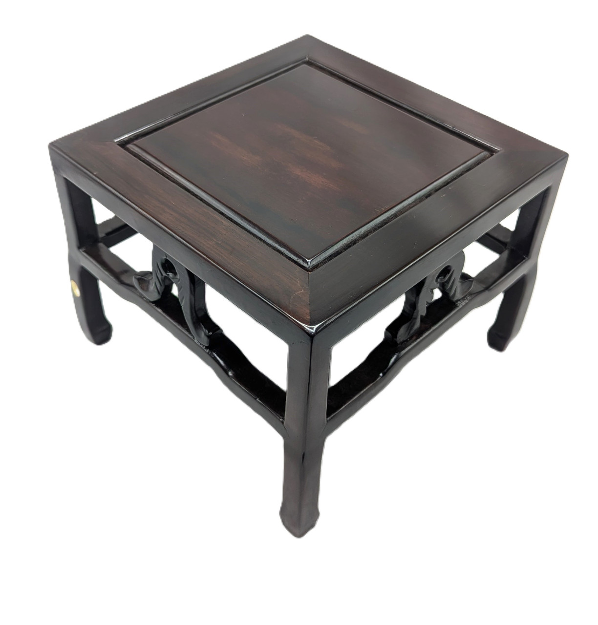 This rare solid-rosewood vase stand features a water-resistant lacquer finish, perfect for tabletop use. A generous eight by eight inch display surface with a six inch height adds height and contrast to any display item. Its dark red mahogany color and plant-based lacquer highlight your collectible, much like a frame highlights a painting. The simple Chinese Ming style adds elegance without detracting from your item.