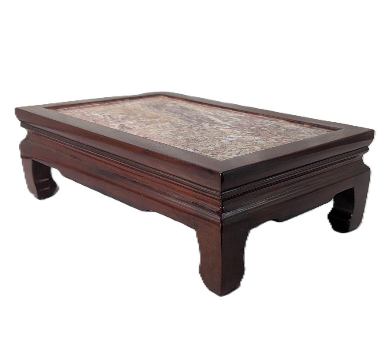 Our 14-1/2-wide rectangular wooden display stand with marble inlay suits your fine rectangular or oblong porcelains, jars, vases, and sculptures. Our simple design enhances any display item, and this wooden stand features a clear, protective lacquer finish. A medium rosewood color goes with any interior. Crafted in simple Chinese Ming style, marble inlay with fine, detailed moldings and curved feet. This wooden stand makes an excellent display choice for your collectible. This wooden display stand will enhance the beauty of your vase, sculpture, or jar. We suggest this for tabletop use or for pairing with an oblong object.